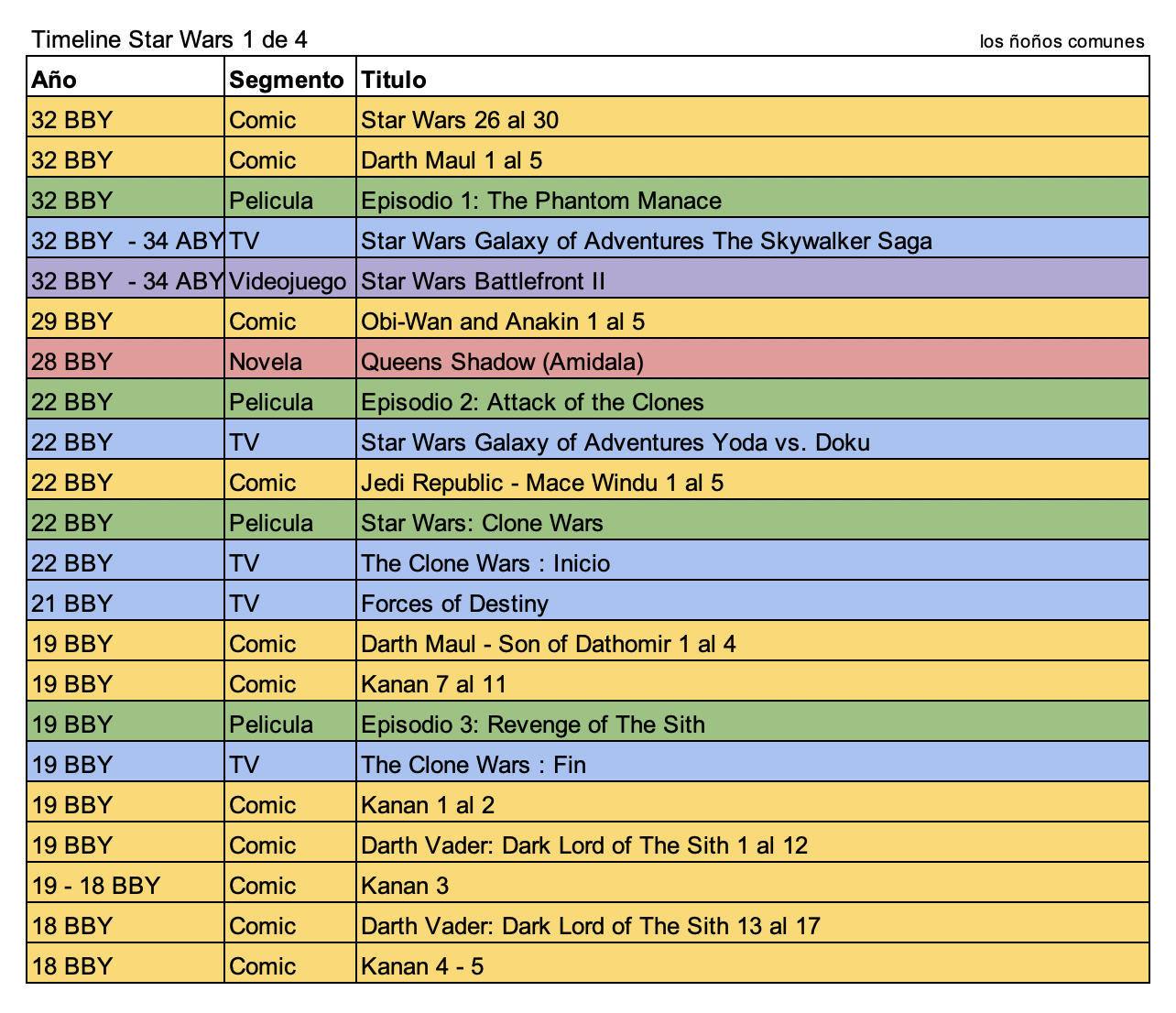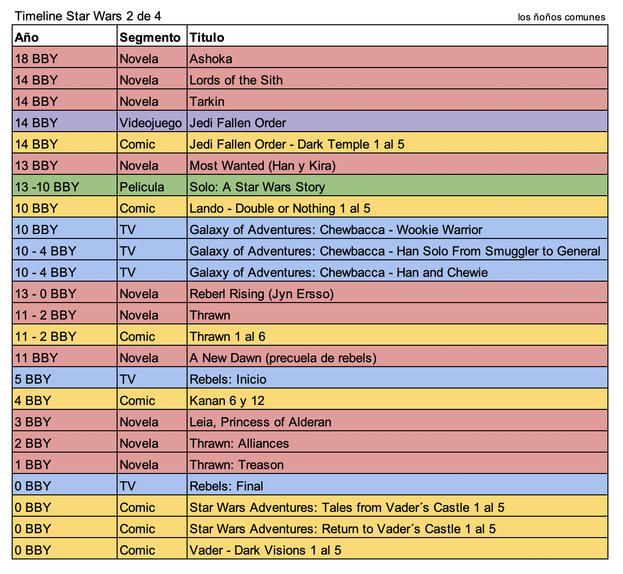 A continuación, te dejamos un timeline de los eventos de Star Wars y como es que van tomando lugar a través de los diferentes medios. Estamos dejando fuera mucho contenido que se deriva de novelas ligeras, historias cortas, juegos móviles o web ya que por lo general no los consumimos o están disponibles solo en otros países.